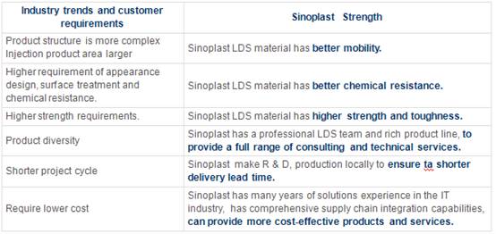 Sinoplast LDS special material technology has applied to the naitonal patent protection. We are the first domestic enterprises to get the German LPKF authorization. The material is good fluidity, easily molding, good dimensional stability and chemical resistance etc..