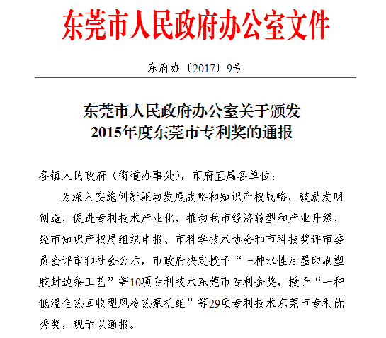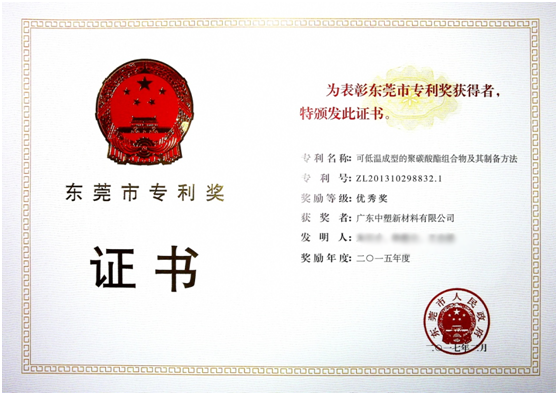 2017年,,,东莞市继续高标准建设国家知识产权树模都会,,,深入实验立异驱动生长战略和知识产权战略,鼎力大举推进专利质量提升工程。。。。在此配景下,,,2017年2月,,,9170金沙依附“可低温成型的聚碳酸酯组合物及其制备要领”的专利手艺获得了东莞市政府授予的“东莞市专利优异奖”。。。。充分彰显了9170金沙在新质料手艺研究领域的实力以及9170金沙人一直开拓探索的科研精神。。。。
